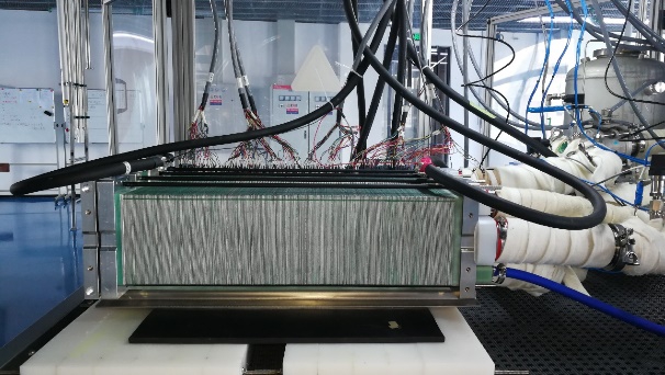 新能源汽车工程中心在去年设计基础上,制备出的金属极板燃料电池单堆在第三方整车厂实测,达到了125KW的最大持续功率,超过设计目标115KW。单堆及其模块测试现场如图1a,1b所示。