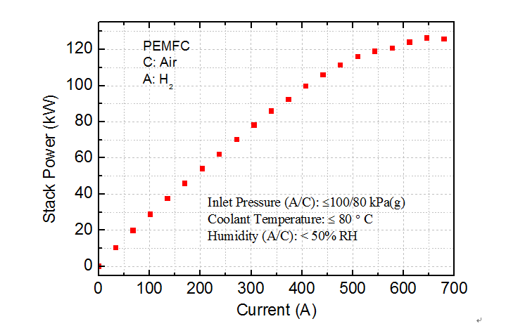 该堆由370节单池构成,其中催化剂、MEA及金属极板均采用自研技术;实测功率曲线如图2所示,最大持续输出功率密度达到3.2KW/L(包括端板、紧固件的裸堆),峰值最大电流密度超过2A/cm2。在115KW设计点,单节电压标准方差为10mV。