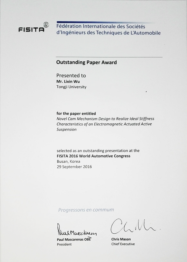 2014级硕士研究生吴利鑫与导师陈辛波教授、2011级博士生殷珺等合作撰写的论文: “Novel Cam Mechanism Design to Realize Ideal Stiffness Characteristics of an Electromagnetic Actuated Active Suspension”,荣获2016年国际汽车工程年会(FISITA)“Outstanding Paper Award”。课题组多年致力于汽车机电一体化系统、新能源汽车底盘系统、电动汽车驱/传动系统的集成设计与控制研究,学术环境宽松、科研创新氛围浓郁,每年吸引多名校内外优秀学子加盟团队。