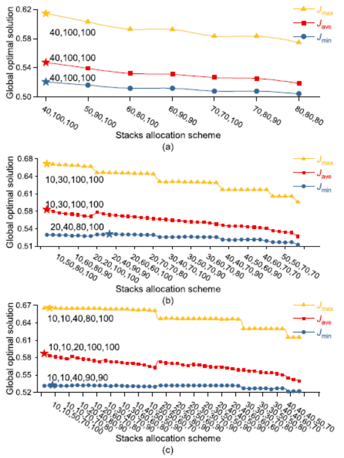 图 2 (a)三个堆、(b)四个堆和(c)五个堆MFCS在不同寿命计算方式、不同电堆分配方案下的全局最优解示例
