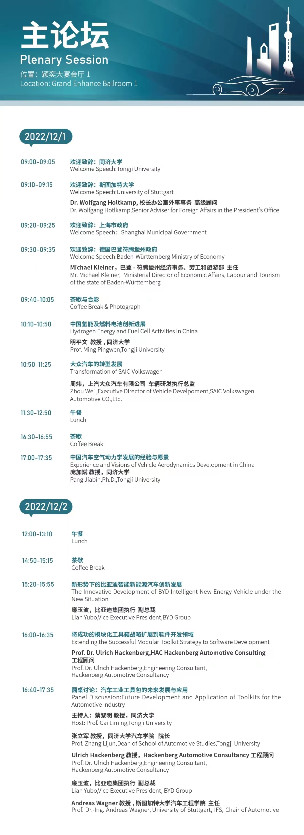 两天的学术日程将邀请到5场主旨演讲,分别来自奥迪前董事会成员Prof. Dr. Ulrich Hackenberg,上汽大众汽车有限公司车辆研发执行总监周炜博士,比亚迪集团执行副总裁廉玉波博士,菠萝视频