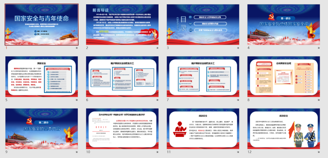 统一制作主题班会课件,主要内容分为“国家安全与总体国家安全观”、“国家安全的基本内容”、“疫情下的国家安全与青年使命”三个部分。在第一部分中,通过介绍总体国家安全观重大战略思想的历史背景,使同学们对国家安全有一个初步的了解。第二部分介绍了国家安全的基本内容,并且围绕与大学生相关性较高的政治安全、国土安全、文化安全、信息安全等内容进行详细阐述,班主任们纷纷通过生动的案例与学生们展开讨论,号召引导学生们肩负起作为中国青年一代的责任与使命。第三部分结合疫情对生物安全和相关的法律进行了重点解读,进一步提升学生的安全与责任意识,提高学生驾驭风险、迎接挑战的本领,增强科学防疫的能力,助力汽车学子在维护国家安全方面做出应有的贡献。