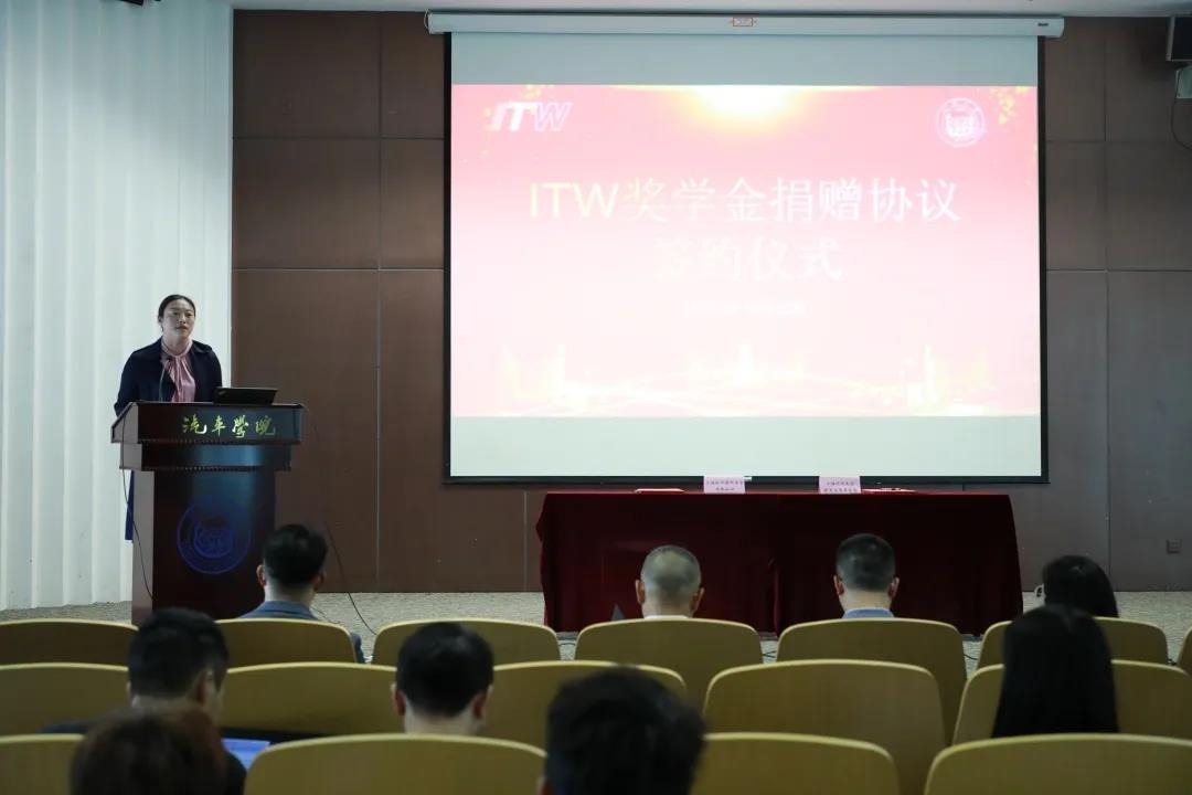 党委书记曹静致辞。她首先对ITW公司捐赠奖学金,助力学生发展表示感谢,并简要介绍了菠萝视频