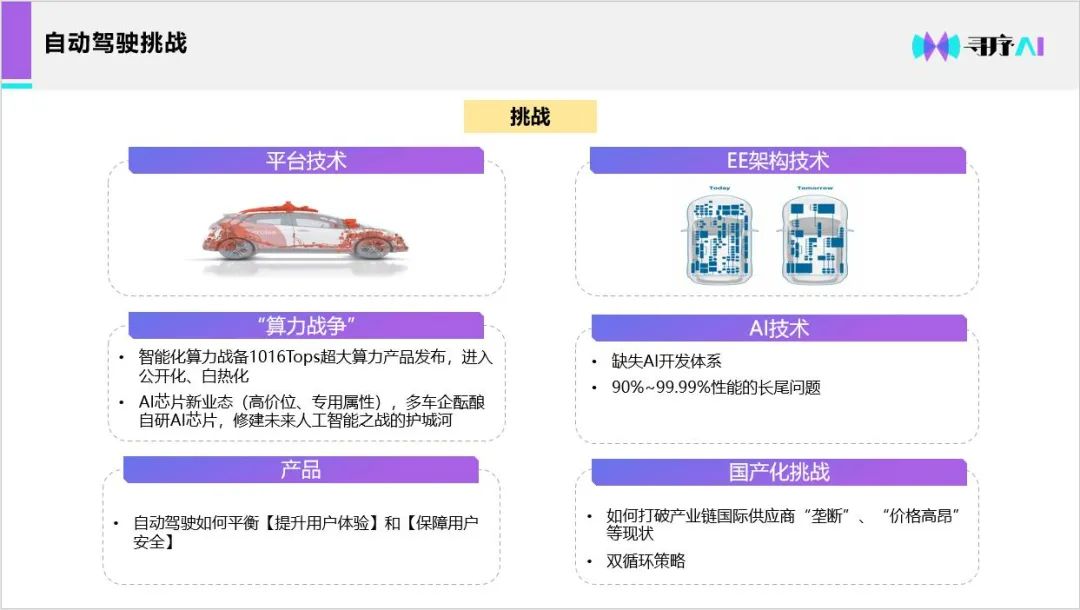 在行业挑战方面,丁华杰博士分别指出,目前行业存在平台技术、EE架构技术、“算力战争”、AI技术、产品、国产化挑战等问题。接着,他指出目前AI技术存在两大技术痛点制约车企数据闭环,其一为开发体系缺少0-1的AI技术能力,缺失完整的AI开发体系,其二为供应体系无法支撑1-N数据闭环能力,长尾场景和突发情况会给安全定义和设计造成极大的挑战,因此,多数车厂无法提供智能汽车全生命安全周期OTA、软件定义汽车难以实现。