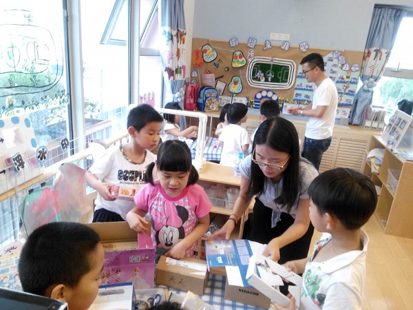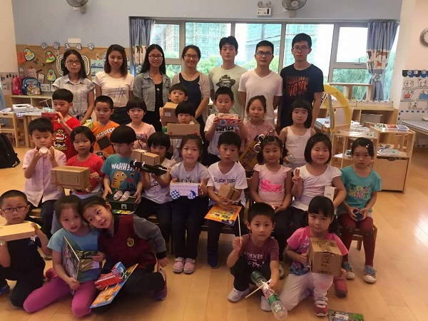 第三个环节是汽车DIY,小朋友们事先从家带来手工材料,在哥哥姐姐们的帮助下,充分发挥自己的想象力、创造力,制作出一台又一台“神奇的小汽车”,用废旧材料来制作汽车,既锻炼了孩子们的动手能力,提高了环保意识,也增进了志愿者和小朋友之间的沟通。