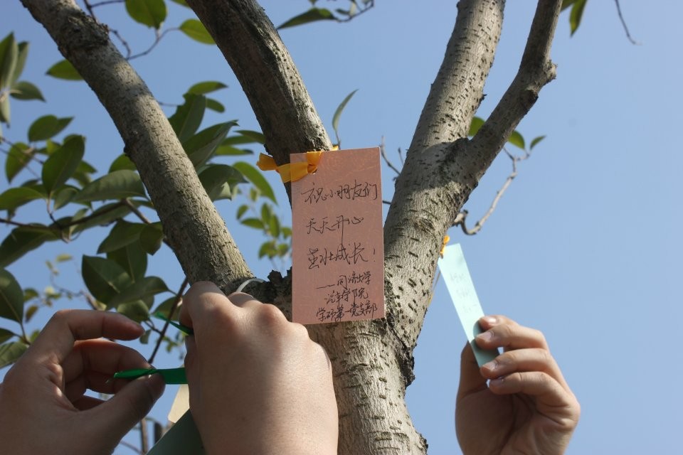 同学们在一张张卡片上写下了自己的愿望,挂到了刚刚栽好的树苗上,希望环境越来越好,树木茁壮成长,表达了对儿童患儿的关心,希望小朋友健康长大,以及新的一年的美好愿望。看着这些刚刚种下的树苗,看着一片片嫩叶随着春风微微的摆动,我们的心情也被这一抹绿色感染,充满了新生的希望。看到这么多的群众和我们一样参与到植树活动中,每个人的心头都多了一份温暖和信心,我们每个人都越来越关注环保,关爱生命,整个社会正在向着和谐发展的目标一步步前进。