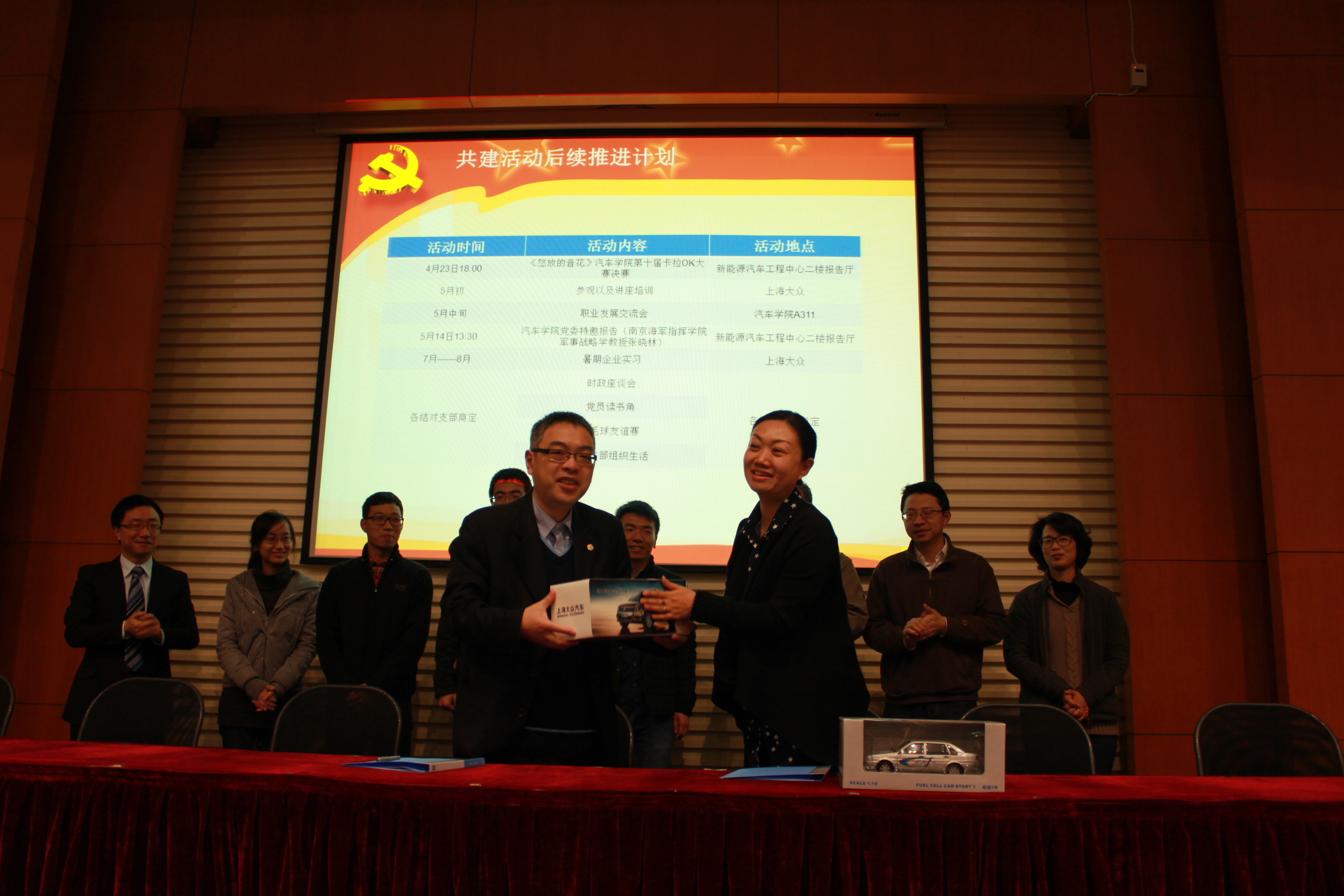 党委陈翌书记和上海大众物流部党总支许青桥书记签署了共建协议,互相赠送了纪念品,并与参与结对共建的8个支部的支部书记合影留念。