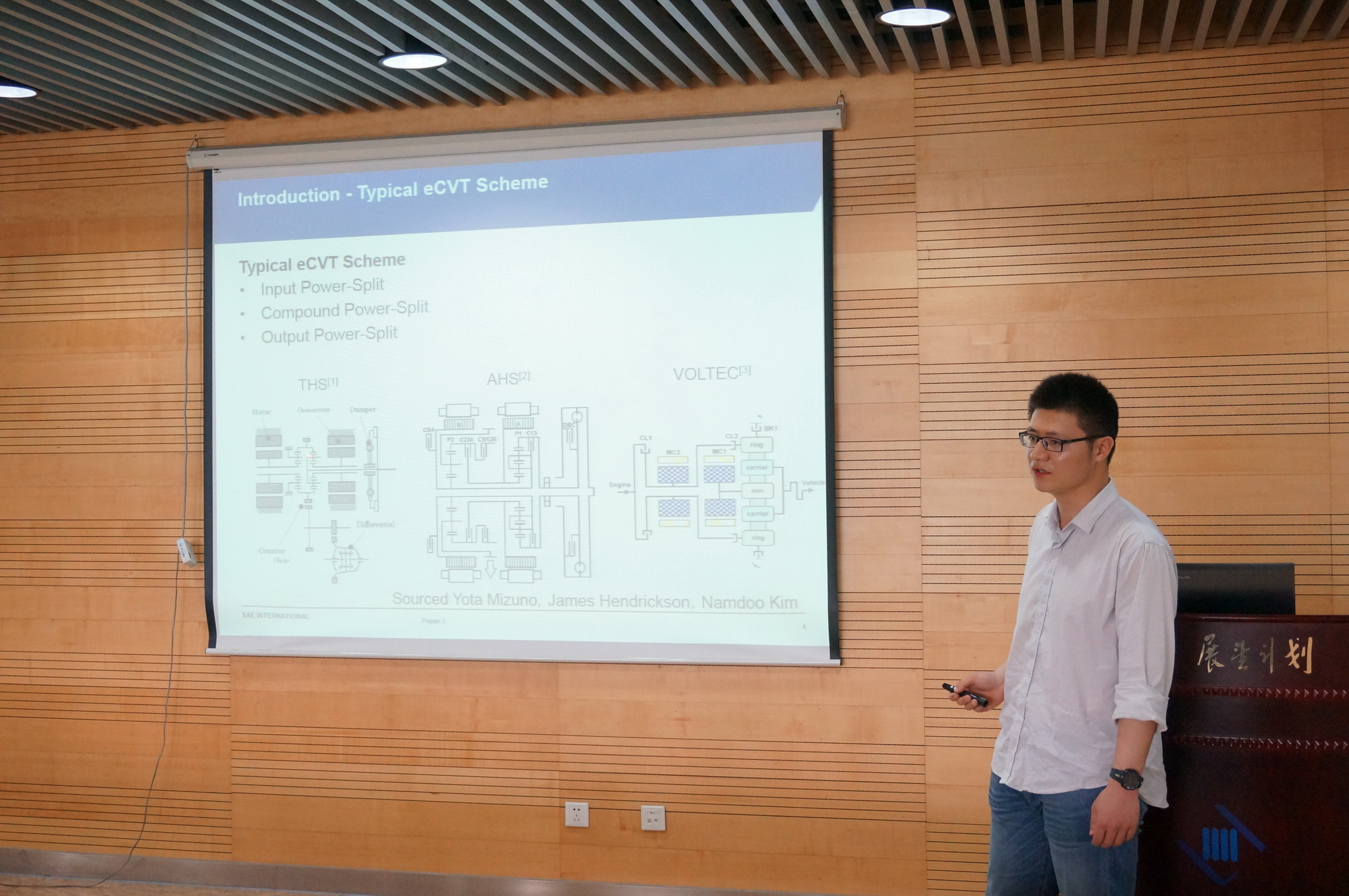 接下来,王晨博士和康哲博士分别对各自的题目做了细致入微、深入浅出的讲解。王晨博士的主讲题目为《复合功率分流eCVT的开发》,由系统整体概念出发,完整地阐述了复合功率分流eCVT的开发流程,通过运行模式和控制策略的设计,搭建了复合功率分流eCVT的仿真模型,进行了样机的开发与测试,并给出了下一步工作的研究方向。其研究工作系统、细致,具有很强的实际意义,尤其是对于打破国外垄断车辆混合动力系统核心技术的局面具有很高的价值,博得了点评嘉宾的称赞,也令在场观众颇为佩服。