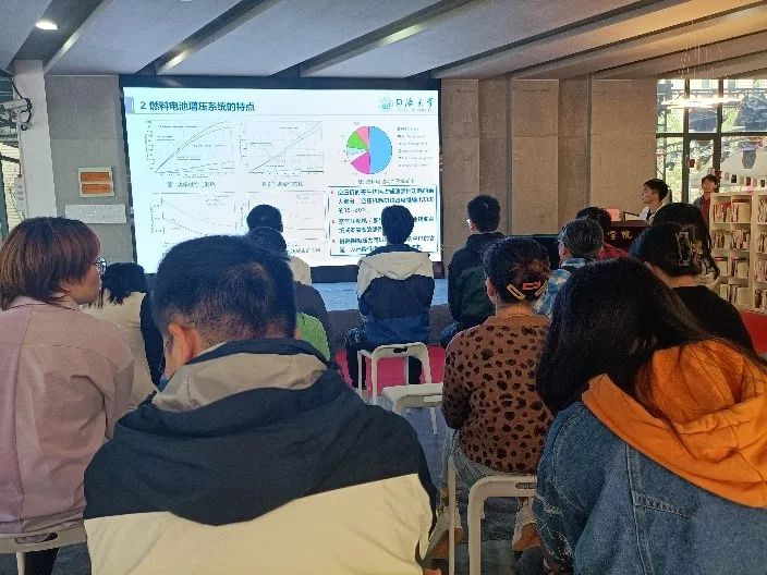 研究生第五党支部的杭朝冬同学以“燃料电池汽车空气供应系统——技术前沿分享”为主题,从燃料电池空气供应系统的定义、结构、特点等信息出发,分享了燃料电池汽车空气供应系统的基本信息和未来研究方向。