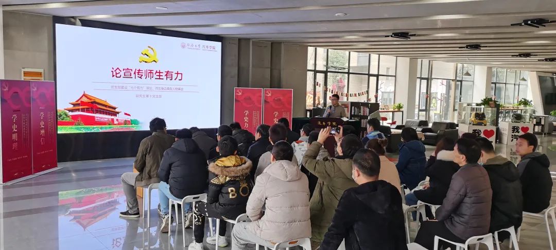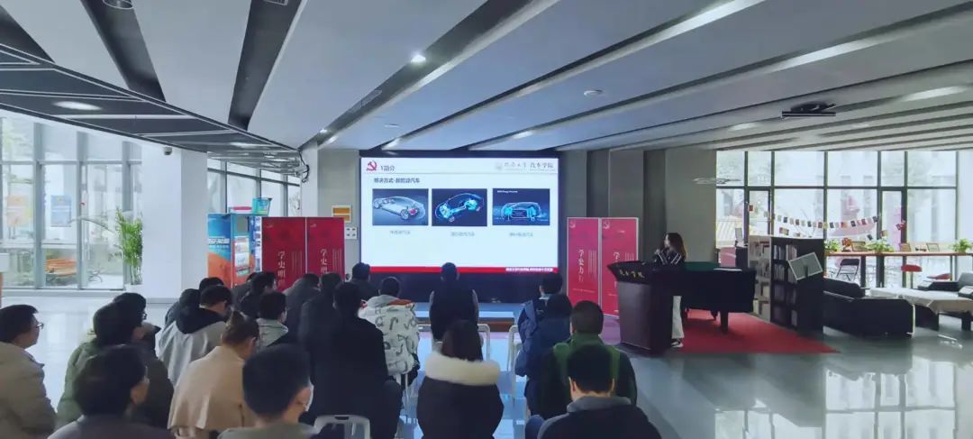 “科技·艺术·人文”大厅顺利举行。参加本次学习的有:研究生第九党支部,研究生第十党支部以及教工第四政治理论学习小组。本次活动主要分为政治思想理论学习和汽车专业知识分享两个部分,由教工第四党支部书记马立英老师主持。