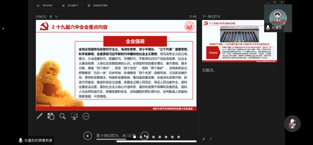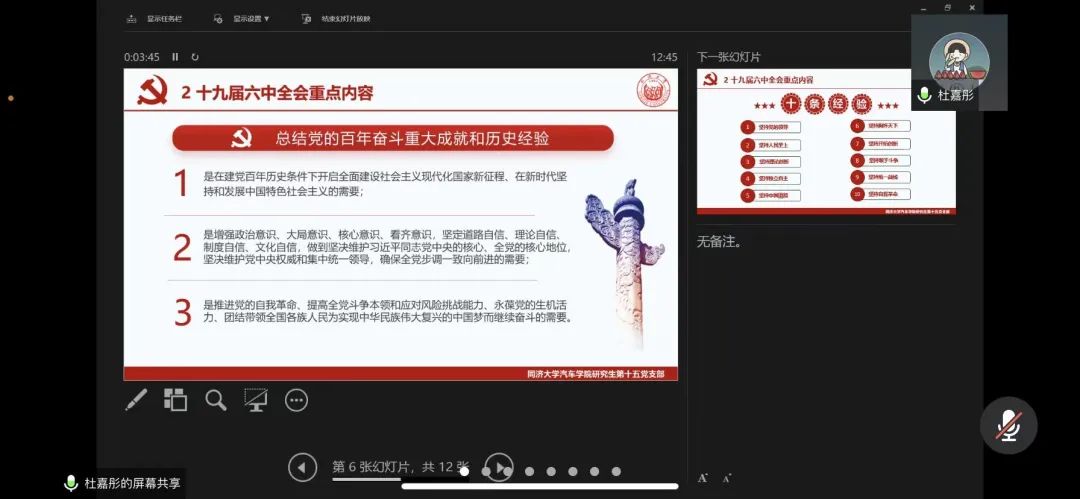 研究生第十五党支部党员杜嘉彤带领全体师生从“全会和决议具有重大现实意义和深远历史意义的原因”“中国共产党能够带领人民从胜利走向胜利的原因”及“一定能实现中华民族伟大复兴的原因”三个方面,学习了十九届六中全会的主要内容与历史意义。分享最后,杜嘉彤同志也呼吁大家,要进一步学习十九届六中全会精神,紧密团结在以习近平同志为核心的党中央周围,牢记历史教训,学习宝贵经验,努力为祖国的现代化事业和中华民族的伟大复兴事业做出自己的一份贡献,不辜负党和人民对我们的殷切期待。