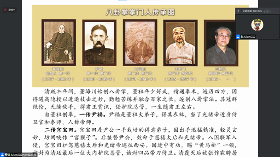 分享伊始,孙治常老师简要地介绍了八卦掌的由来与传承。同时,他也结合八卦掌内外兼修、神形具备、刚柔并济的特点,阐释了中华古哲学中“天人合一、崇礼尚德、自然和谐”的思想。