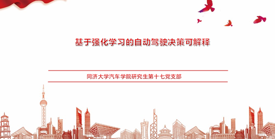活动第二部分,研究生第十七党支部的崔志浩同学向大家分享了“基于强化学习的自动驾驶决策可解释”的报告。