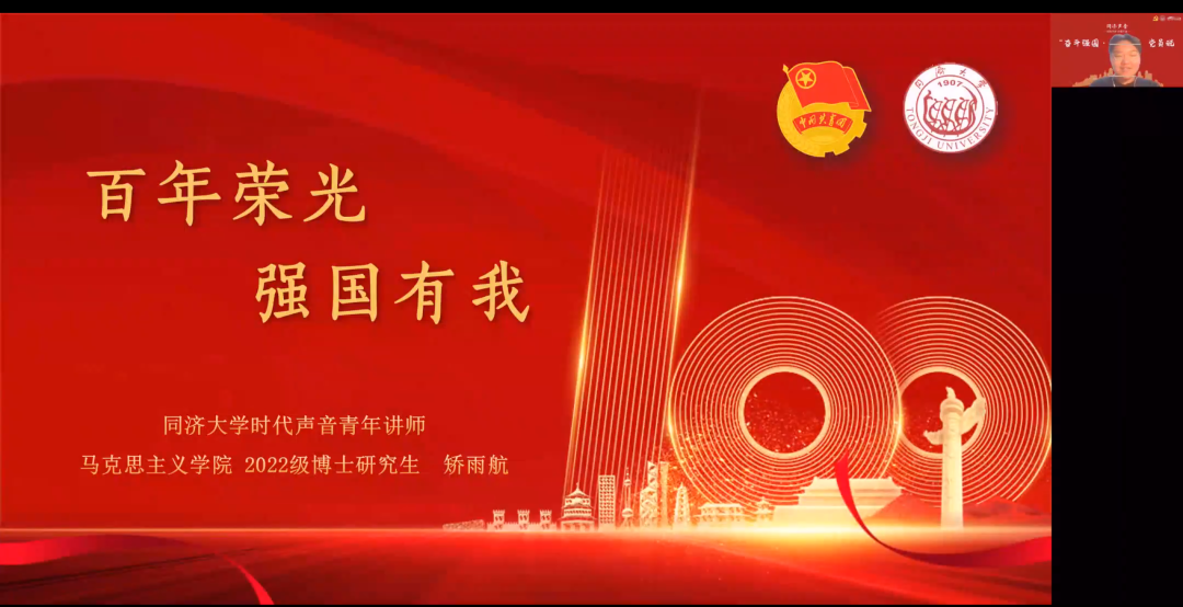 时代声音传播社的学生代表矫雨航同学以”百年荣光 强国有我“为题进行分享。分享中,她从百年前青年团成立时青年人的热情和同济青年的光荣传统两个方面讲述了千千万万青年在团的培养下坚定信仰、跟党走,投身于革命滚滚浪潮的感人故事。同时,她也号召全体同济青年学子把忠诚书写在党和人民的事业中,把青春播撒在民族复兴的征程上,把光荣镌刻在历史前进的史册里,继续“与祖国同行,与科教济世”,接续同济人的光荣传统。