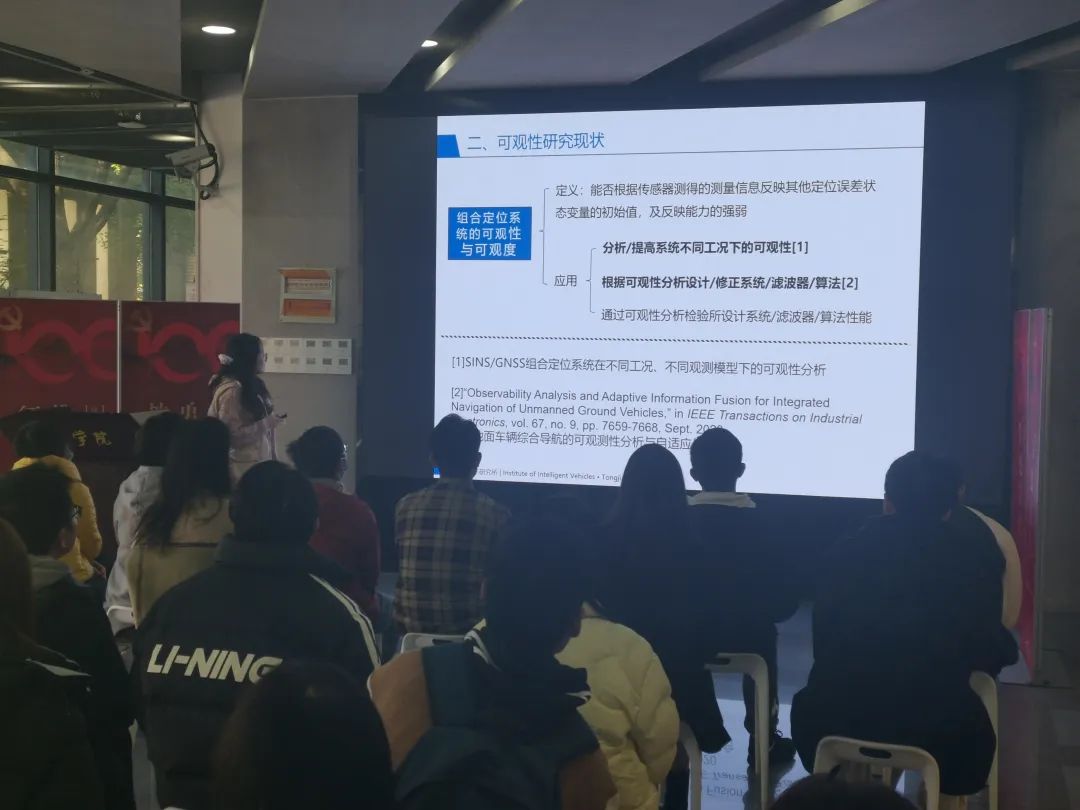 随后,由研究生第八党支部黄敏青同志带来主题为“组合定位系统的可观性分析方法”的专业知识分享,介绍了智能网联汽车的发展历史及组合定位系统的研究背景及意义,分享了可观性分析的研究现状,通过实例阐释了组合定位系统的可观性分析方法及应用,指出提升系统的可观性有助于提升估计精度,增强智能网联汽车环境感知、决策规划、运动控制的能力。