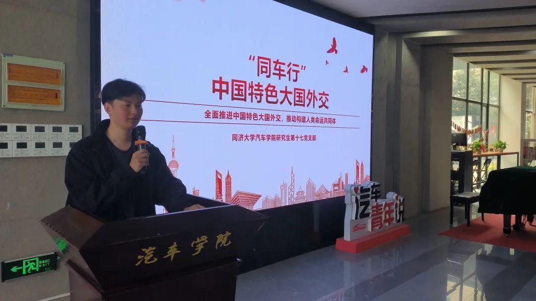 首先,研究生第十七党支部王怀德同学带来题目为“中国特色大国外交”的理论分享。他详细介绍了中国特色大国外交的缘起、发展和成就。党的二十大报告指出,我们全面推进中国特色大国外交,推动构建人类命运共同体,坚定维护国际公平正义。在新时代十年的伟大变革中,习近平总书记亲自谋划指挥、引领推进了波澜壮阔的新时代外交实践,中国特色大国外交得以全面推进,在全球变局中开创新局,在世界动乱中化危为机,战胜了各种艰难险阻,办成了不少大事要事,取得了全方位、开创性历史成就。
