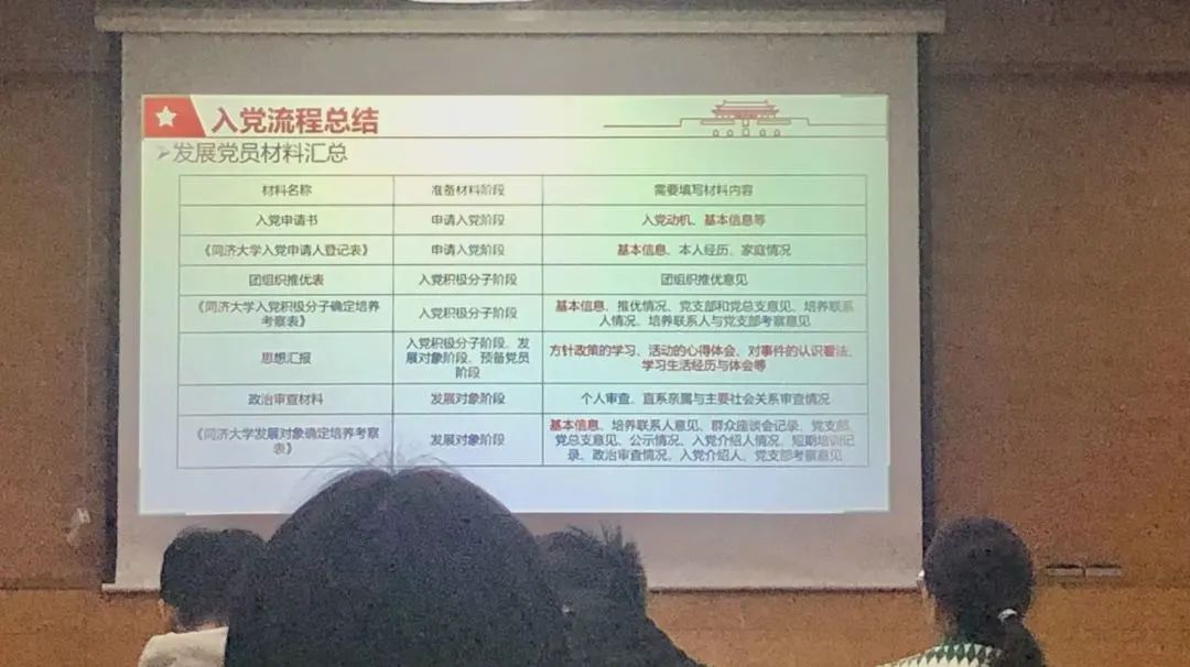 发展成为一名党员是一件光荣而神圣的事情,入党的流程复杂严格。讲座中,主讲人周捷具体介绍了从“提交入党申请书-积极分子-发展对象-预备党员-党员”各阶段的流程、所需时间,每阶段应撰写的思想汇报,政治审查及党组织意见等。