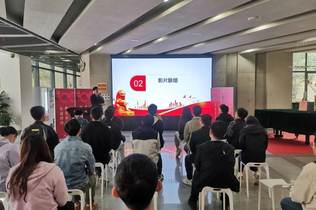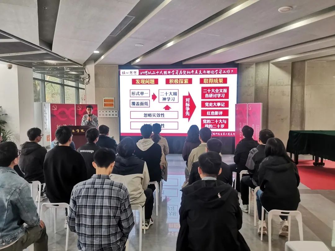 随后,支部组织委员赵亚轩以“十年记忆,十年印象”为主题汇报了十年来的党史大事记,回顾了十年来党的光荣历程、伟大成就和宝贵经验。支部的五位党员以“赓续血脉,话映红色”为主题,基于《大国重器》、《长征》、《面向世界的中国共产党》、《我们一起走过 致敬改革开放40周年》和《香港回归全记录》五部影片讲述了自己对二十大全文中新观点、新思想、新论断的理解。