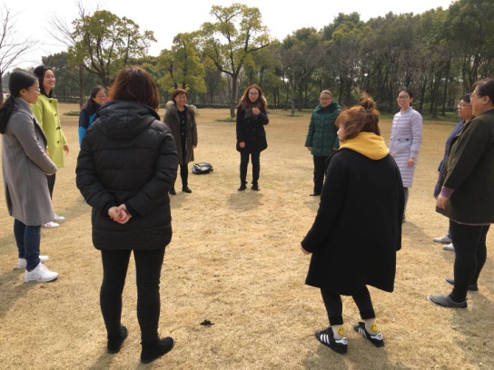 大约一小时的步程后,老师们来到一片空旷的大草坪,开展团队素质拓展活动,“萝卜蹲”、“解手链”等游戏深得老师们青睐,活动现场气氛活跃热烈,老师们踊跃参与,献策献计,最终两个小组的“解手链”比赛将活动现场氛围推向了高潮。