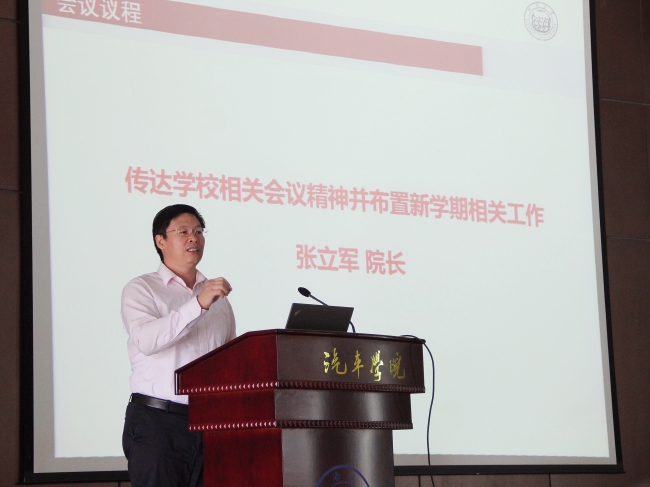 张立军院长向大家传达了近期学校相关会议精神,介绍了学校长聘教职体系改革、2019年度全校专业技术职务评聘及考核续聘工作的有关情况,并就新学期各项工作做了布置,重点推进人才培养、学科规划、教师队伍建设等工作。张院长指出,菠萝视频