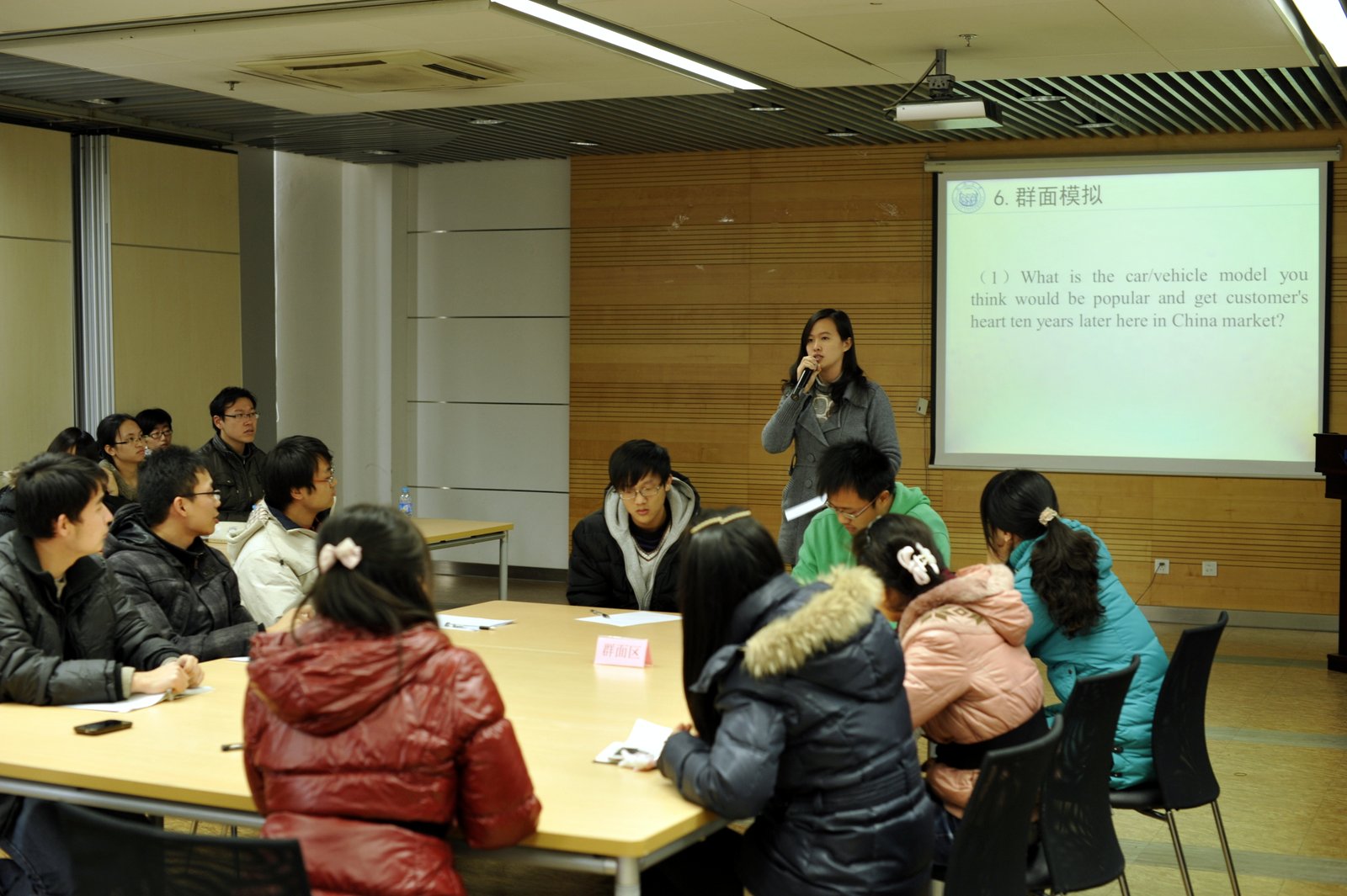 然后进行了群面模拟。由10名同学临时组成小组,黄先生现场给出群面题目,并限定30分钟的讨论时间。期间同学们积极发表个人观点,群面结束时由代表进行了英文总结陈述。最后黄先生和洪女士对群面中同学们的表现进行了点评。另外黄先生介绍了福特HR在群面时所要考核的重点,即应聘者对题目的观点、表达自己观点的方式以及在遇到不同意见时的应对方法。