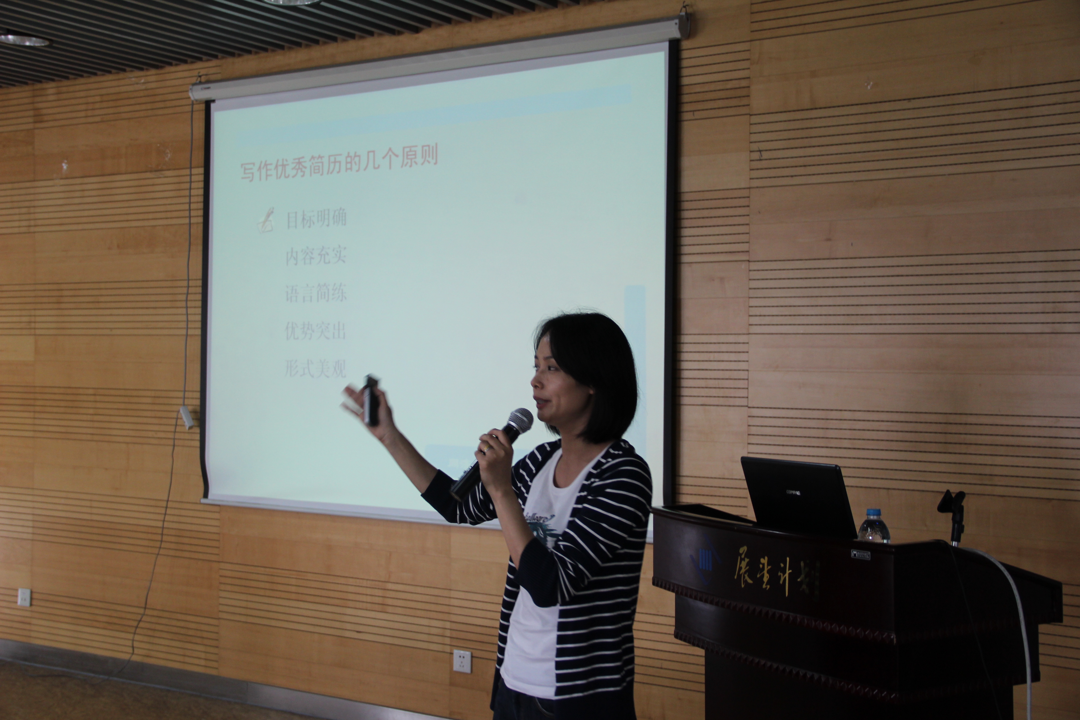 举办此次活动的背景和目的,希望同学们都够珍惜听讲座的机会,通过参加培训增长技能,最终找到满意的工作。接着,朱华珍老师就优秀简历的制作原则、常见错误、简历的结构和形式、简历中的用词技巧等内容结合具体案例做了详细的讲解,并回答了同学们的提问。