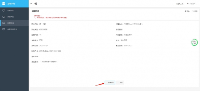 本次应聘报名采取网络报名的方式进行。应聘者实名注册、成功登录后,按照《招聘系统使用说明》(见附件)填报应聘信息。每人限报1个岗位,不得兼报其他岗位,报名多岗位者取消应聘资格。