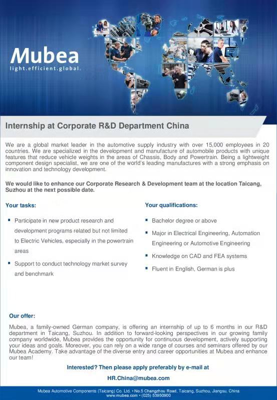 慕贝尔公司希望能招募一位或者两位本科或者研究生段实习生,可以是中国国籍或者德国国籍,语言和专业各方面可以的话将在慕贝尔中国和德国两地实习工作。