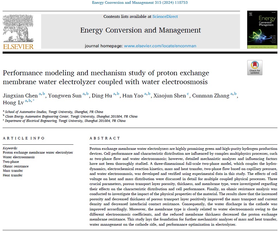 本研究得到了国家自然科学基金(No. 52271013)、上海市科技创新行动计划(No. 23DZ1200600),以及上海智能新能源汽车科创功能平台的支持。详细研究描述请参阅论文原文及附录:Chen J, Sun Y, Hu D, et al. Performance modeling and mechanism study of proton exchange membrane water electrolyzer coupled with water electroosmosis [J]. Energy Conversion and Management, 2024: 118753.