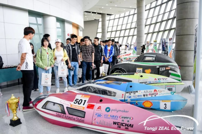 志远车队二十周年纪念车展。展厅内陈列从成立至今,志远车队队员们自主设计制造的共23辆节能赛车,车队队员为到访来宾介绍节能赛车的设计元素和历史荣誉。