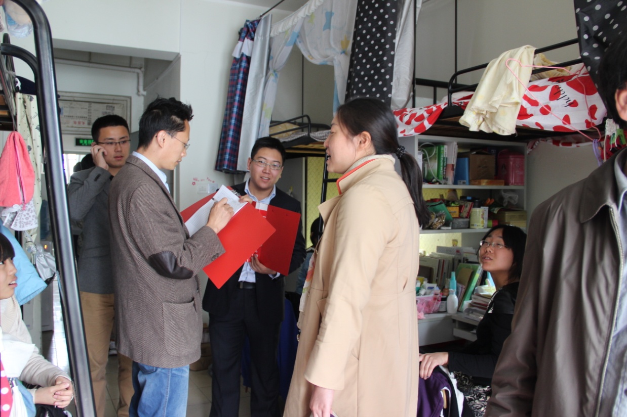 老师们先进入女生宿舍进行参观,除个别寝室的同学反应冷漠外,大多数同学都与老师们进行生活以及学业方面的亲切交谈。女生宿舍大都比较干净整洁,一些同学利用简单的小物品,营造出了自己宿舍独特的文化,充满着浓浓的生活气息。