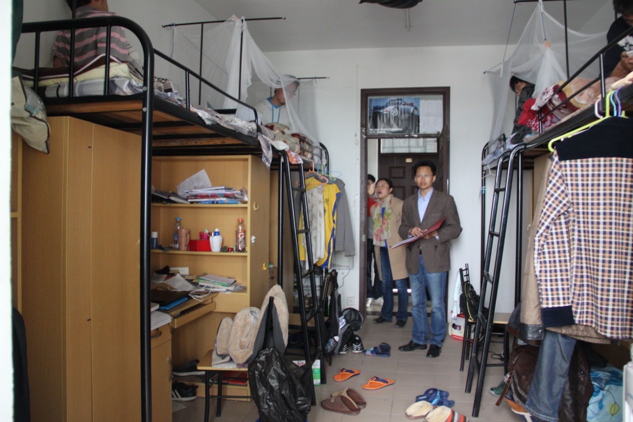 随后老师们进入男生宿舍,发现了一些问题,有的寝室没有做好开窗通风的工作,导致异味很大,老师们都难以进入,有的寝室床铺没有进行整洁,地板也没有清洗等等。老师们对此进行了批评,指出了需要改正之处。同学们都虚心接受,将会在有待提高的地方多加努力。虽然与女生宿舍有些差距,但大部分男生宿舍卫生状况良好,物品摆放整齐,同学们都热烈的欢迎老师们的到访,总体情况令人满意。