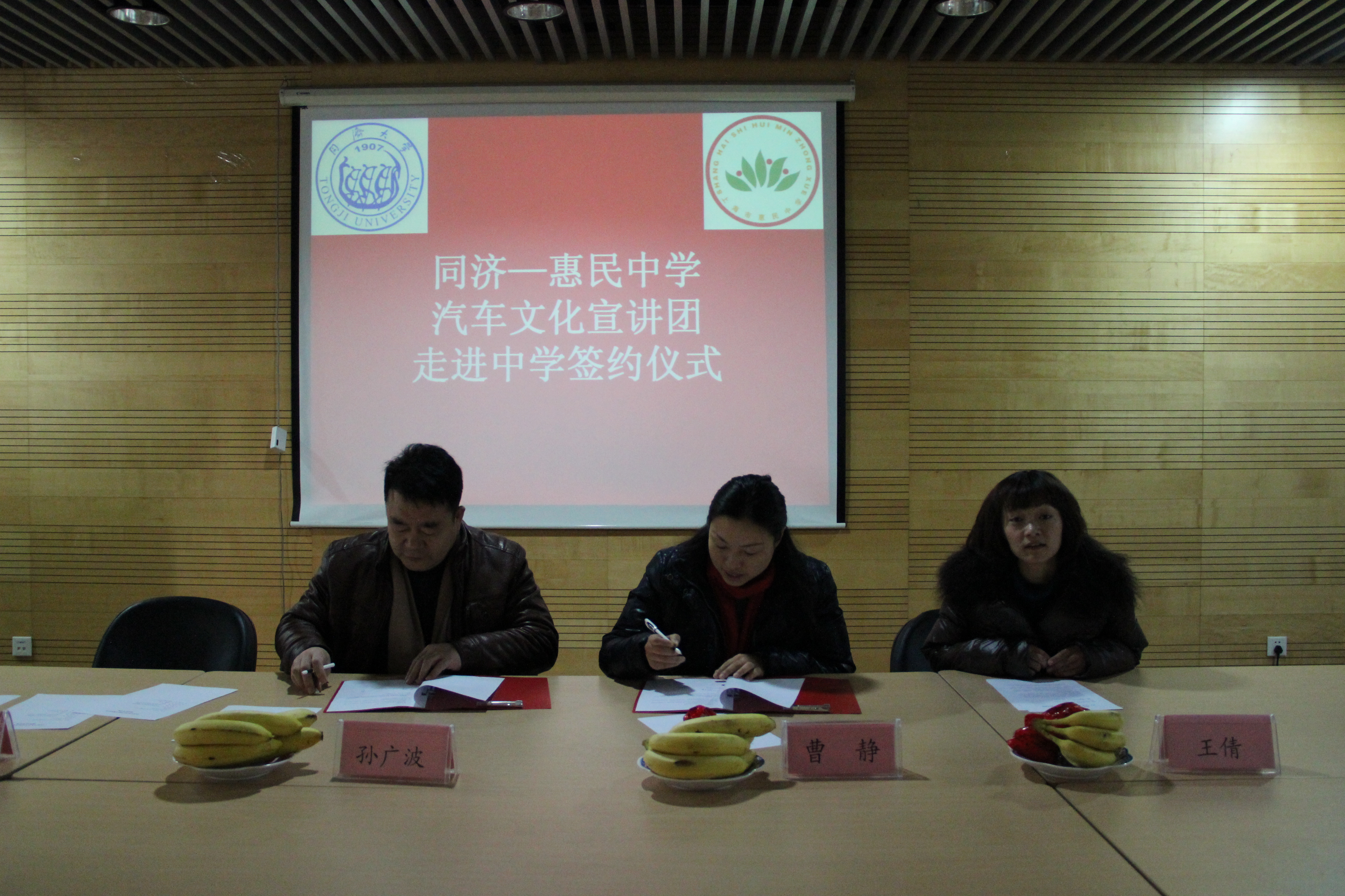 1月17日上午,上海市惠民中学校长孙广波一行走访菠萝视频,为了让中学生走进大学城,争取通过与大学的合作,开展适用于中学生,能够增加他们渴望了解大学的兴趣,提升中学生人文素养、实践能力、创新意识且有意义的实践教育活动。同时,使大学生更好地利用现有资源服务于社会,发挥菠萝视频 汽车文化宣讲团自身特长,通过活动凝聚团队,探索实现“知识,能力,人格”三位一体的育人模式。由菠萝视频党总支副书记曹静老师同孙校长签署了汽车文化宣讲团走进中学系列活动共建协议。