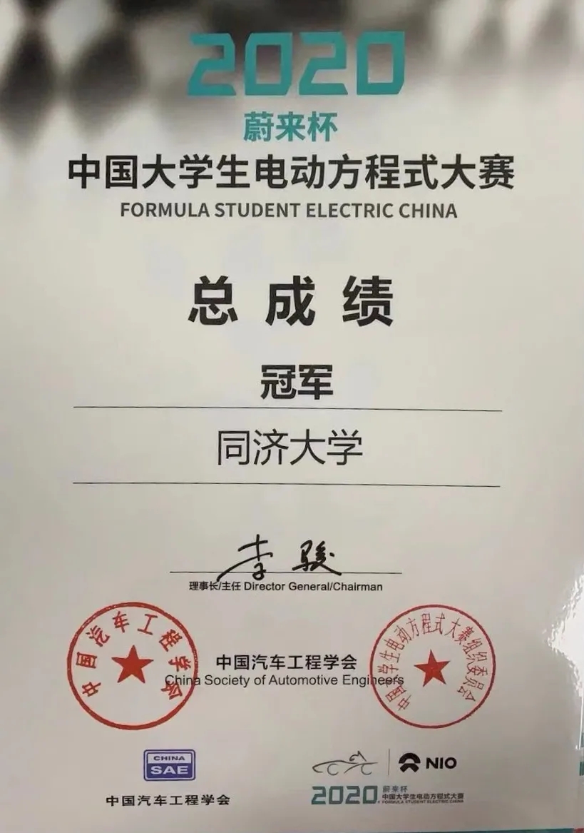 同济电车队获得:中国大学生电动方程式大赛总冠军,其中,设计报告第一名,直线加速第一名,耐久性能第三名,8字绕环第二名。