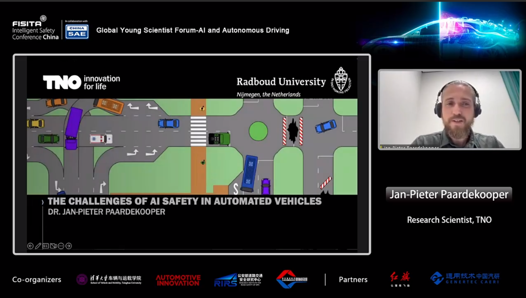 TNO研究员Jan-Pieter Paardekooper发表了题为"自动驾驶汽车中人工智能安全性的挑战” 的演讲。为促进自动驾驶汽车的安全性,介绍了三个关键研究领域:1) 运行设计域和运行域之间相似性/差别的量化;2) 系统正确行为的量化;3) 系统在运行域内性能的量化。
