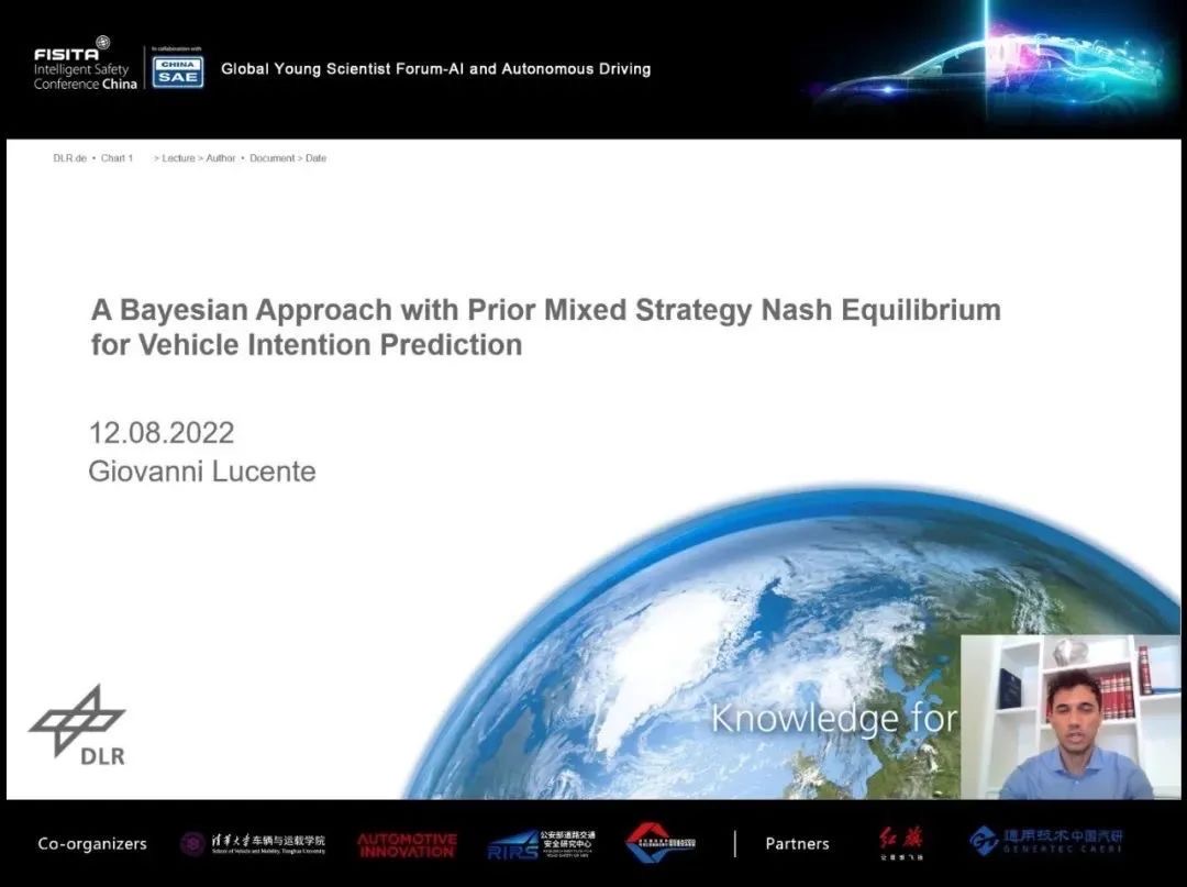 德国航空航天中心交通系统研究所Giovanni Lucente博士发表了题为"基于先验混合策略纳什均衡的贝叶斯车辆意图预测方法” 的演讲。提出一种预测交通环境中车辆未来轨迹的方法,考虑了来自传感器的车辆实际状态信息,以及它们之间的相互影响。