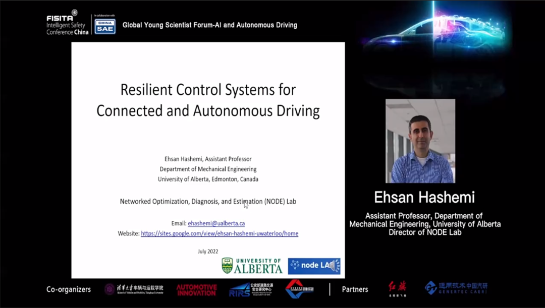 阿尔伯塔大学机械工程系助理教授Ehsan Hashemi发表了题为"用于网联自动驾驶的弹性控制系统” 的演讲。介绍一种车内网络的舆论动力学方法,来实现自动驾驶系统和智能网联汽车的状态估计和稳健控制。主要目的是通过设计轮胎级估计方法,估计受力情况和自动驾驶车辆的纵向/横向滑移,进而提高驾驶安全性。、