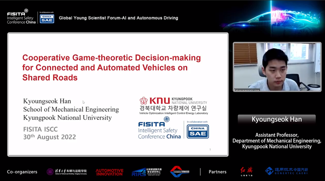 庆北大学机械工程学院助理教授Kyoungseok Han发表了题为"公共车道上的智能网联汽车合作博弈决策” 的演讲。讨论了智能网联汽车的博弈决策。首先基于车间通信系统提出了考虑前方交通流的智能网联汽车最佳决策算法,其次,讨论了混合交通流中智能网联汽车之间的合作博弈。