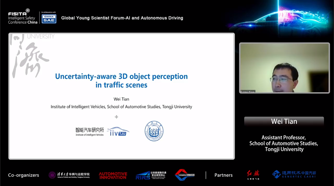 助理教授田炜老师发表了题为"交通场景中考虑不确定性的3D目标检测” 的演讲。通过考虑神经网络的不确定性,讨论了交通环境中的三维物体检测方法。重点介绍了二维视觉表现和三维空间属性之间映射的概率建模及最新研究进展。