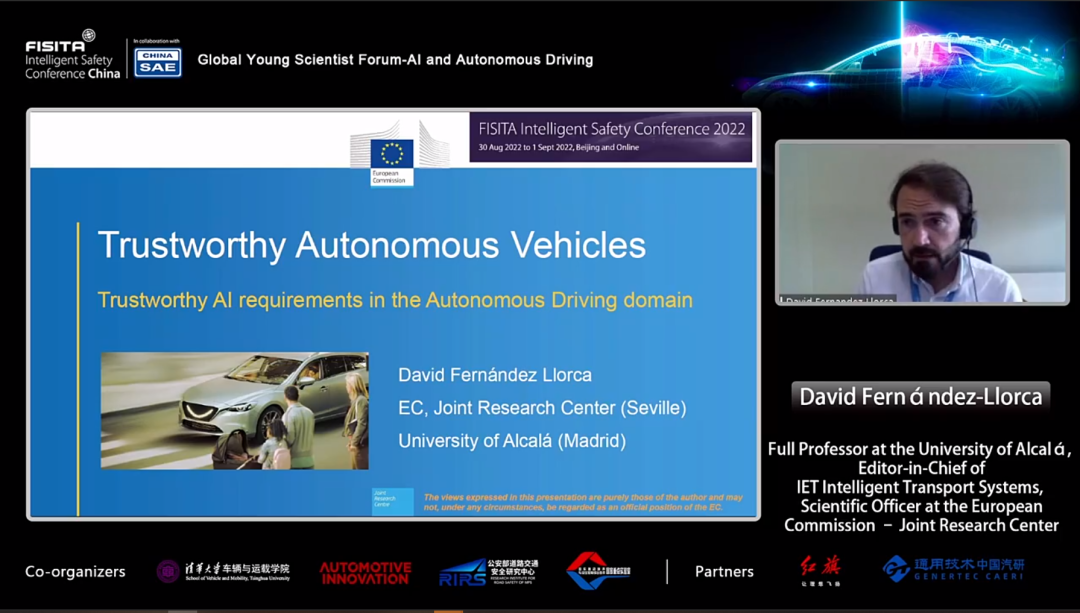 阿尔卡拉大学教授、IET Intelligent Transport Systems主编David Fernández-Llorca发表了题为"自动驾驶领域的可信人工智能需求” 的演讲介绍了欧盟委员会人工智能专家组提出的最新框架,对人工智能系统提出了七种关键的可信度要求,并概述了嵌入自动驾驶汽车的人工智能系统未来需要解决的主要挑战。