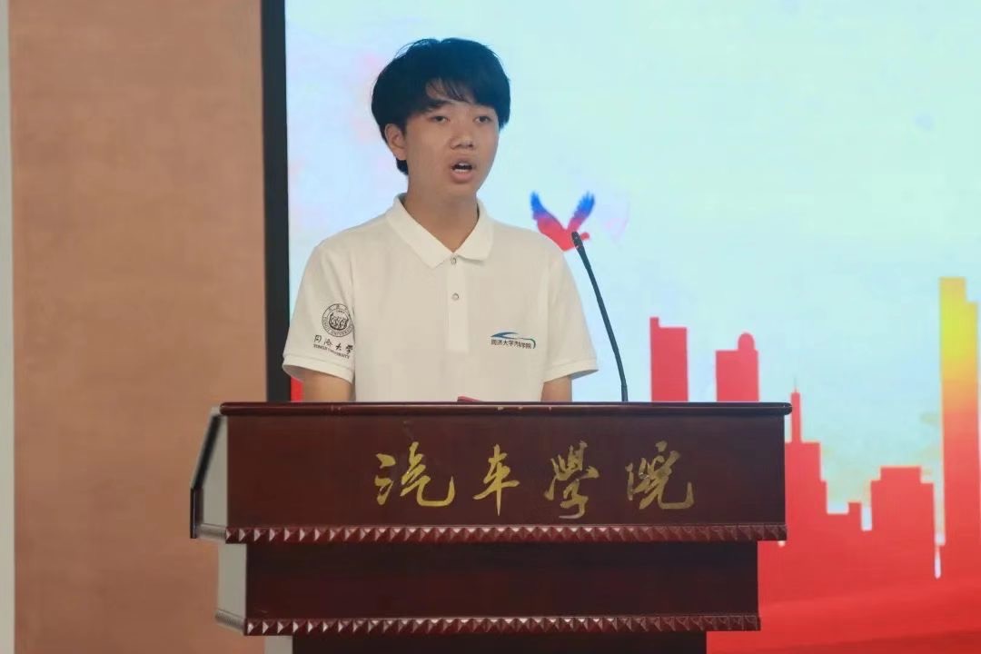 2021级(2)班的蔡昱颉同学作为新生代表进行发言,表示要仰望星空、脚踏实地,努力提升自己的专业技能、专业素养以及专业水准,培养创新思维,为青春梦想奋斗,成为未来我国汽车产业的支柱力量。