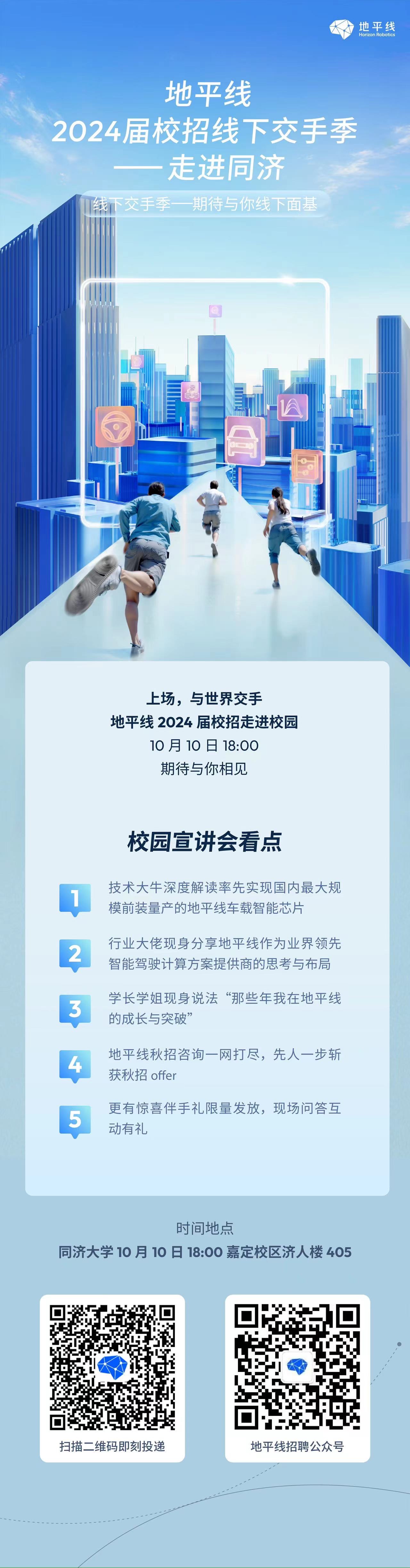 地平线2024届校招线下交手季——走进同济宣讲会时间:10月10日(周二) 18:00宣讲会地点:嘉定校区-济人楼405 技术大牛分享、学长学姐现身说法、HR答疑解惑,现场更有惊喜伴手礼限量发放~同时接收简历投递!期待与你线下面基!